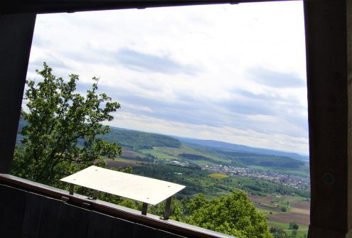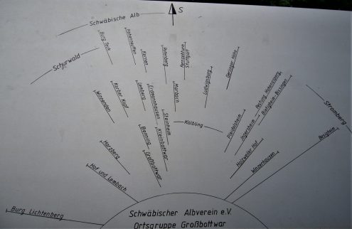 Die Tafel im Südfenster des Turmes gibt Orientierung über das Bottwartal hinweg bis Marbach, Hohenasperg, Lemberg, die Höhen um Stuttgart (Fernsehturm, Solitude und Engelberg). In blauer Ferne erkennt man die Schwäbische Alb mit den, bei gutem Wetter deutlich zu sehenden Bergen Teck und Neuffen.